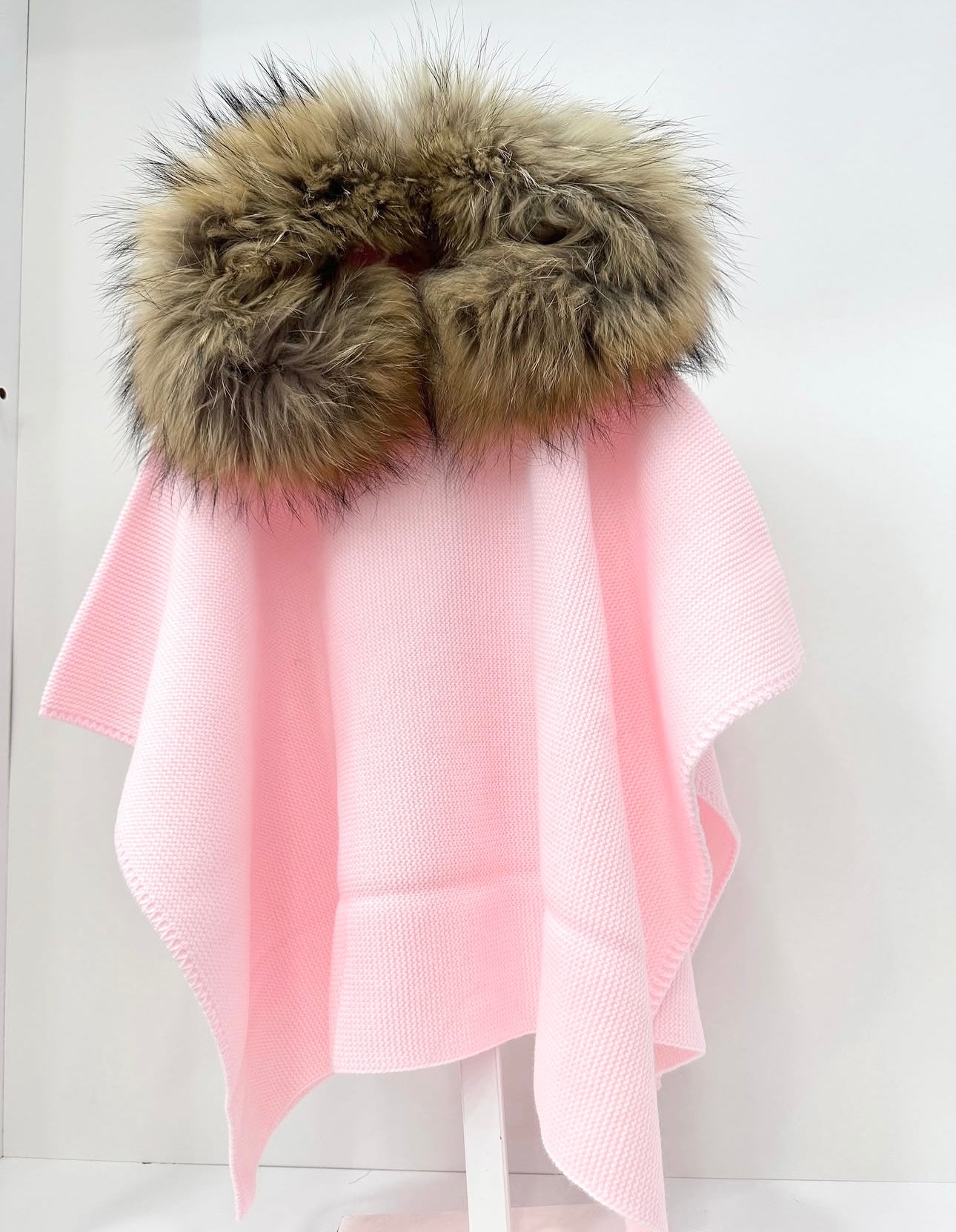 Questa mantella in 100% pura lana e collo in volpe è dotata di bottoni estraibili intorno al cappuccio per rimuovere la pelliccia