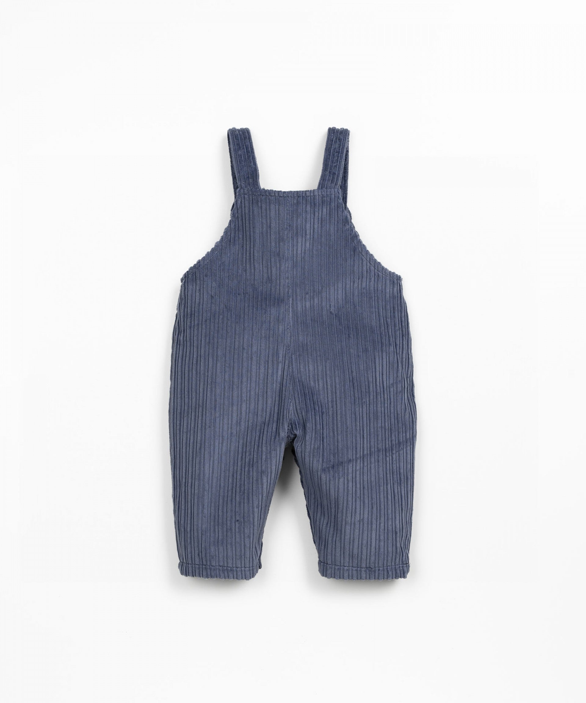 Questa salopette è realizzata in velluto a coste di cotone e cotone riciclato, Il modello ha spalline, apertura frontale con bottoni in cocco, apertura tra le gambe con bottoni automatici in metallo senza nichel (apertura tra le gambe fino alla taglia 18M) e una tasca sul petto.