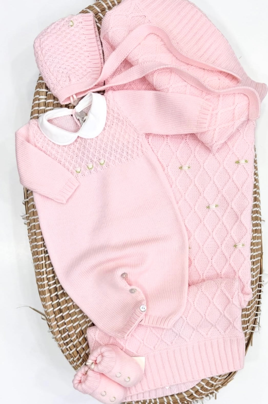 lavorazione a maglia intrecciata sul corpetto, ricamo realizzato a mano con roselline , bottoni in madreperla